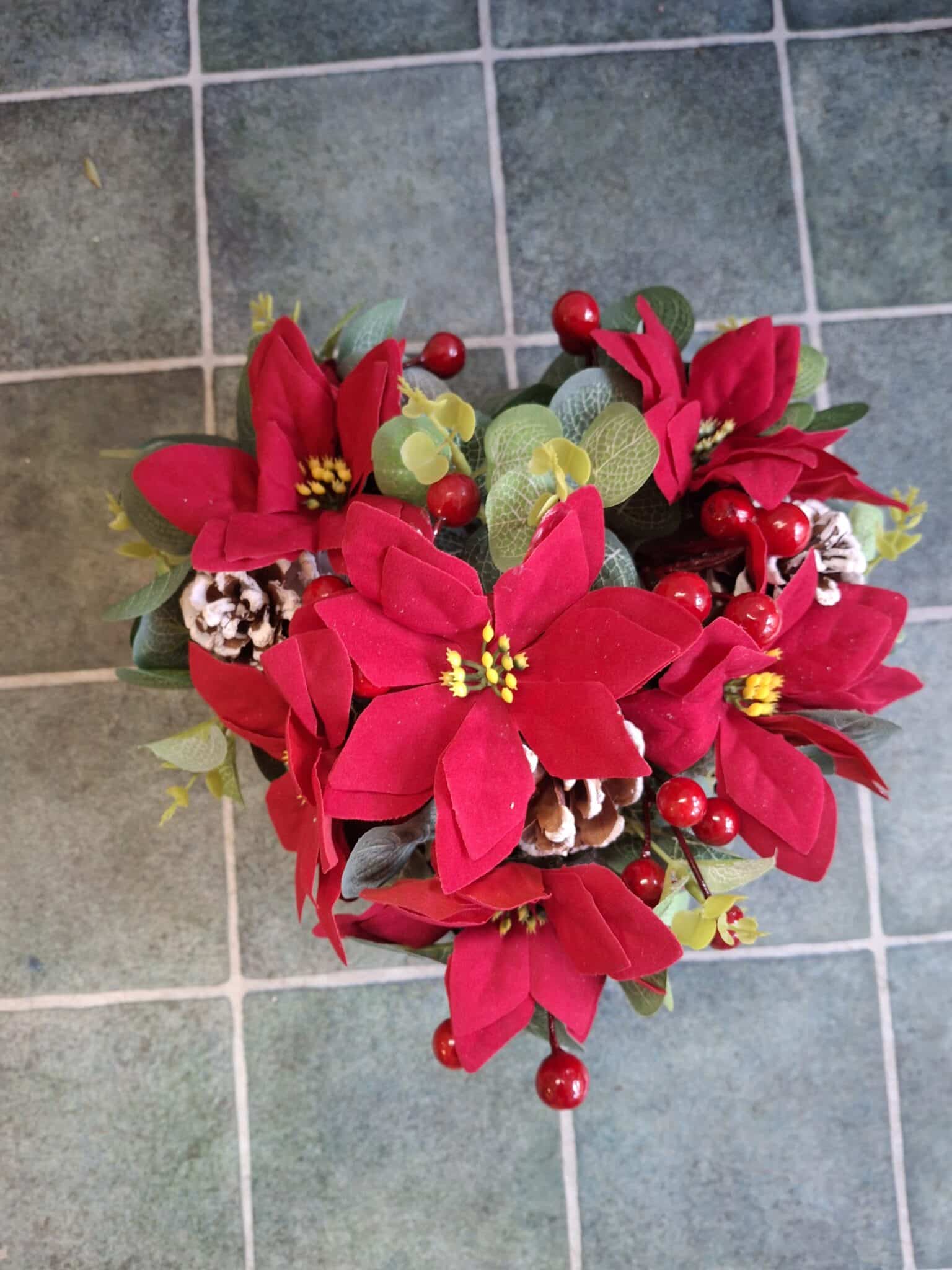 Our Faux festive heart is created in a Heart shaped container using artificial greenery and flowers