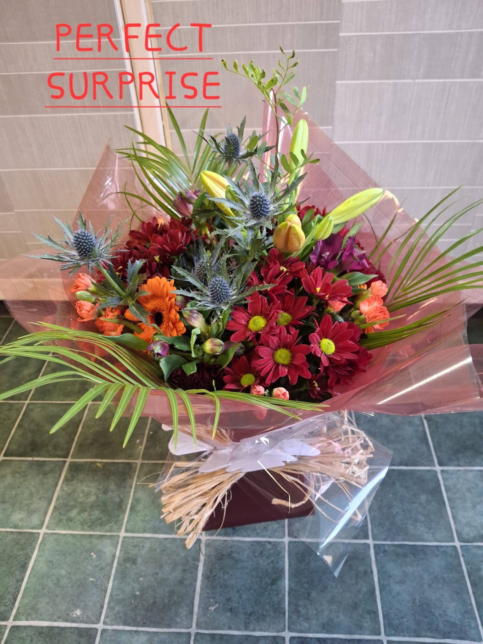 A beautiful hand-tied bouquet that includes orange and burgundy tones