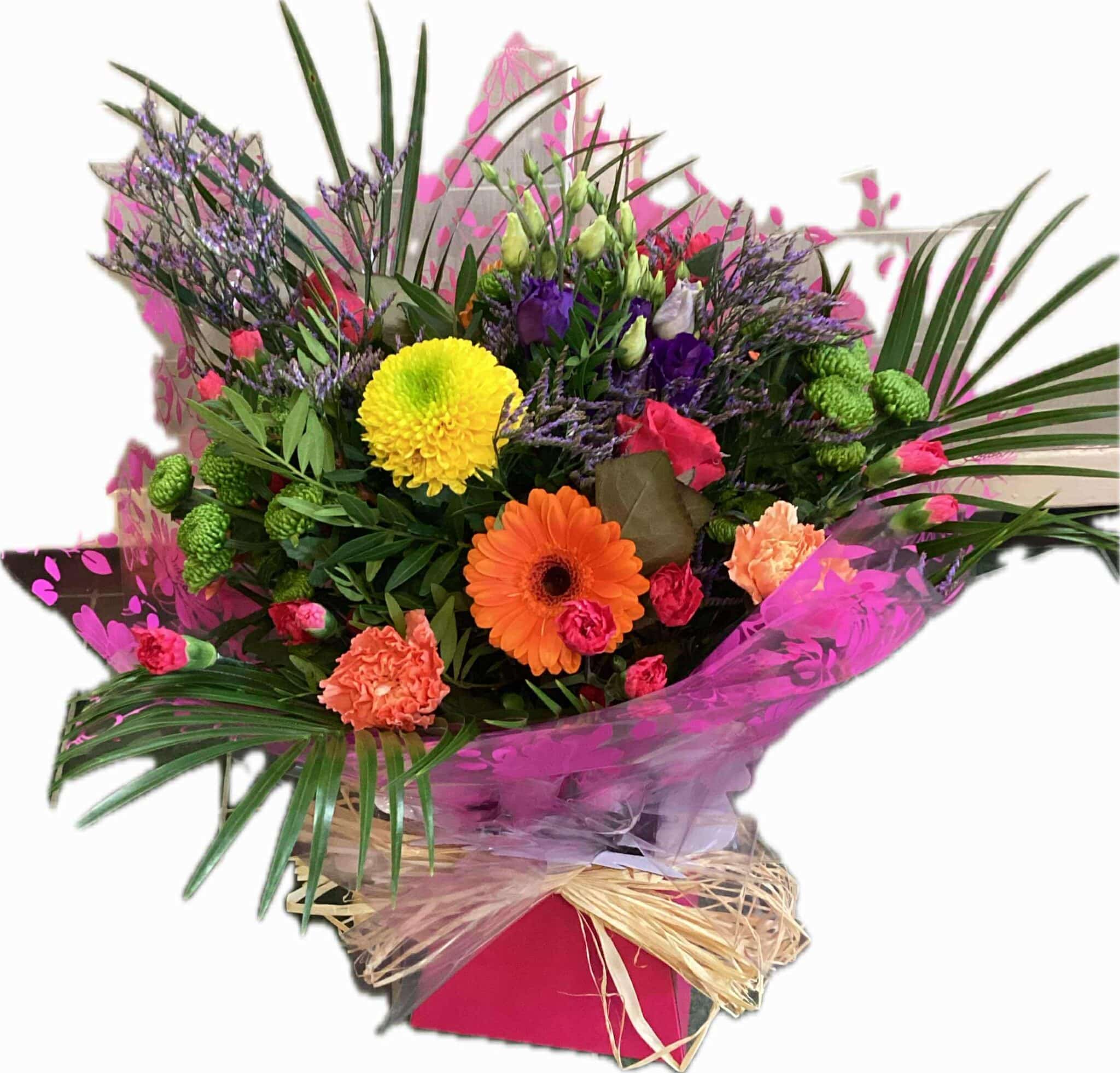 our vibrant hand tied bouquet is a colourful display of yellow oranges cerise and purple tones finished off in a cerise box and Raffia bow